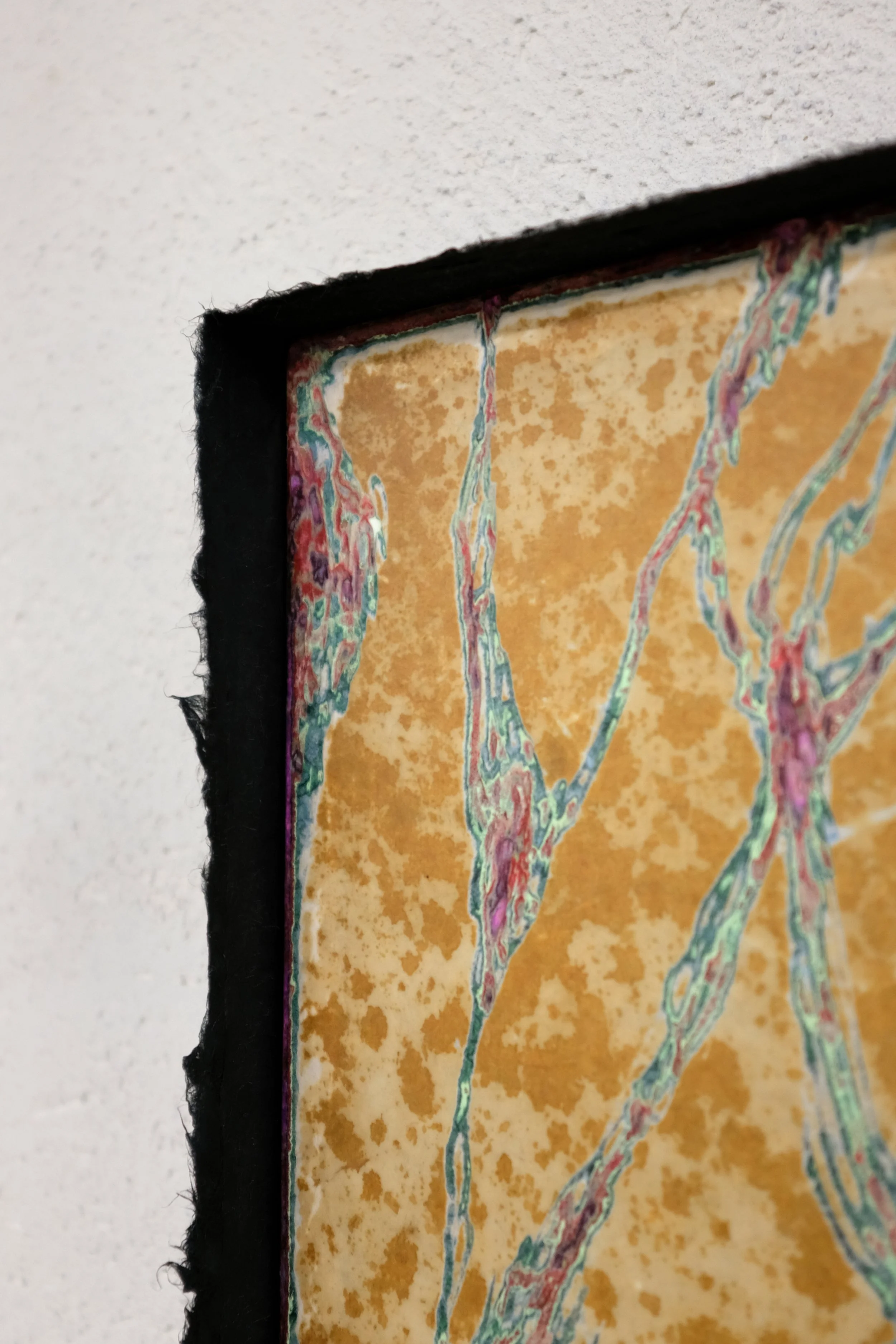별 333-334, 75 x 144 cm each, deckled hanji edges, singed ottchil hanji by 장지방, pigment dyed hanji, fibrous hanji, seaweed hanji, fluorescent magenta acrylic, & fluorescent chartreuse acrylic on linen hemp, 2025